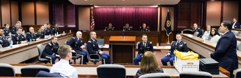 The United States Army Court of Criminal Appeals (ACCA) recently held oral arguments for U.S. v. Mayo at the College of Law. Students had the unique opportunity to observe the JAG Corps in action, as well as meet with and ask questions of the Army officers involved.