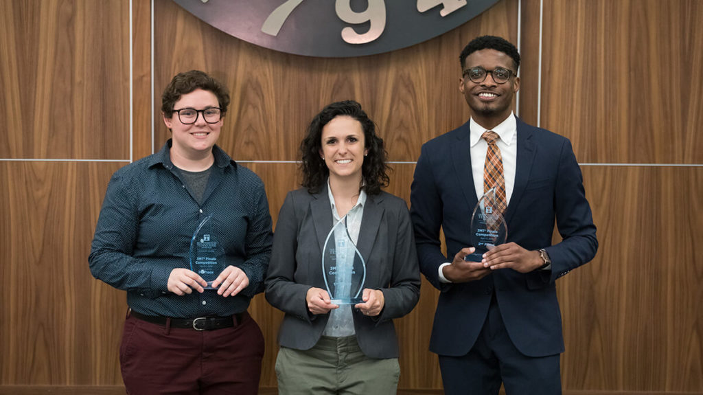 The Three-Minute Thesis competition challenges graduate students to present a compelling talk on the significance of their thesis or dissertation topic in just three minutes and using only one slide to convey their research. The university hosted preliminary rounds throughout the spring semester and narrowed the field of finalists to 12. Those finalists competed for the three top positions on April 3.